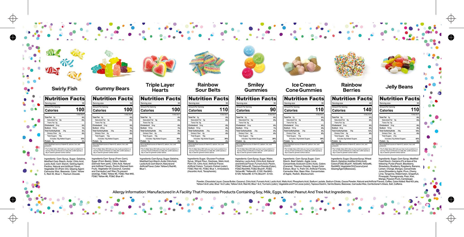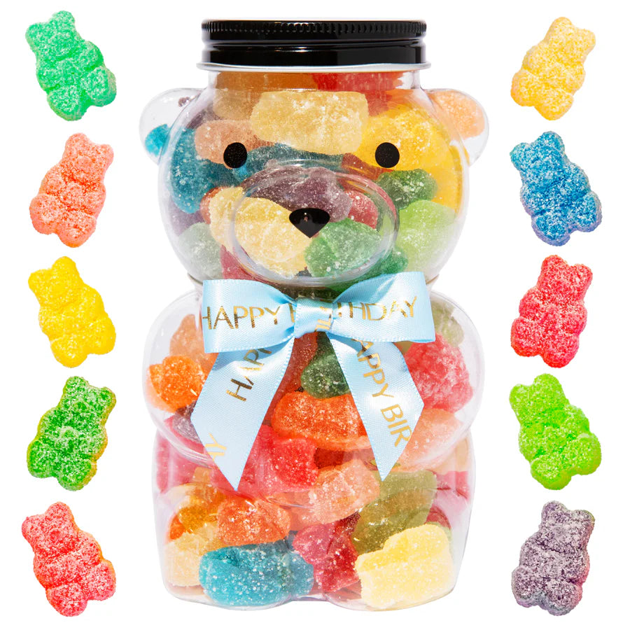 Completing the trio is the lovable Happy Birthday Bear Jar, filled with approximately one full pound of sour gummy bears in an irresistible rainbow of flavors: Cherry, Pink Grapefruit, Watermelon, Strawberry, Orange, Blue Raspberry, Lime, Grape, Green Apple, Mango, Pineapple, and Lemon. The clear bear-shaped jar features a charming red bow and a luxe Purple Plum gold-foil lid label. Once the candy is gone, the jar becomes a reusable keepsake for trinkets, coins, or refills.