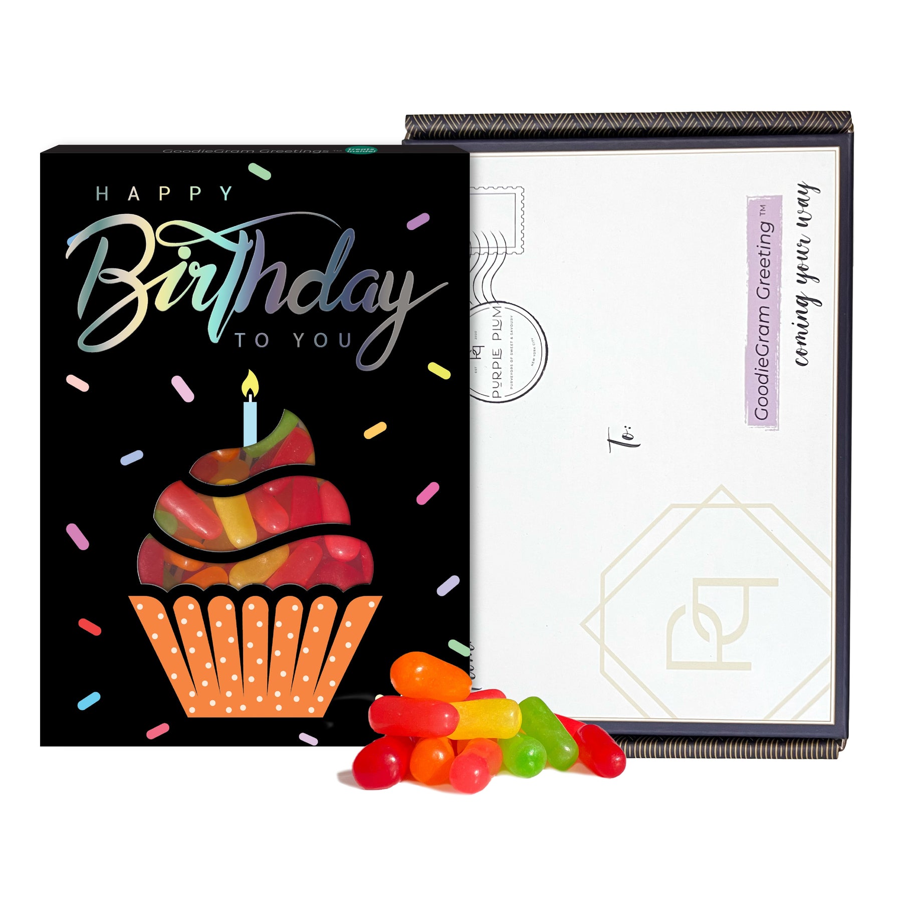 Paired with the board is the GoodieGram Greeting™ – Happy Birthday Edition, an all-in-one greeting card and gourmet treat. Open the interactive card to reveal a peek-a-boo window showcasing a festive 4 oz treat bag of Assorted Fruit Chews. Inside is a removable pull-out message card with space to write a personal birthday wish. Each GoodieGram arrives in a premium mailer, making it perfect for both in-person gifting and easy shipping.