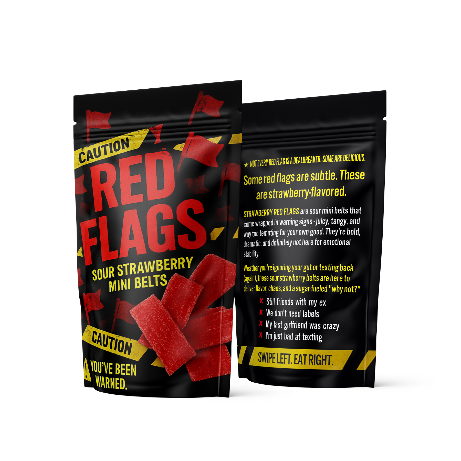 Red Flags are sour strawberry mini belts that look like a bad idea… and taste like an even better one. Juicy, tangy, and coated in just the right amount of sour sugar, these chewy little belts are bold, dramatic, and absolutely not here for emotional stability.